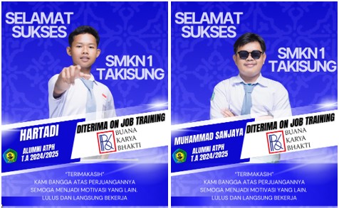 Selamat diterima kerja di PT. BKB Alumni SMKN 1 Takisung, Anda telah mengharumkan namamu, orang tuamu, gurumu, dan sekolahmu tercinta.